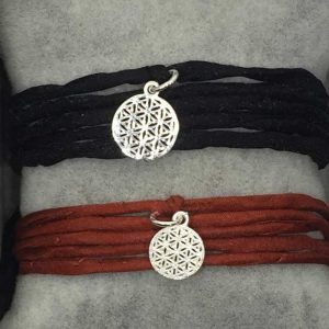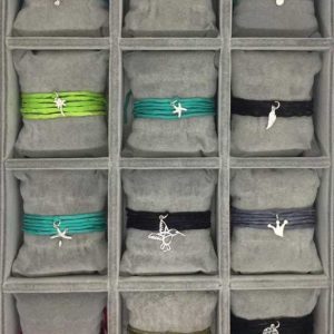 Armbänder mit verschiedenen Aluelementen und dünnen Lederbändern in verschiedenen Farben erhältlich. Verschluss mit Verlängerungsketterl.
