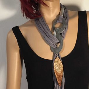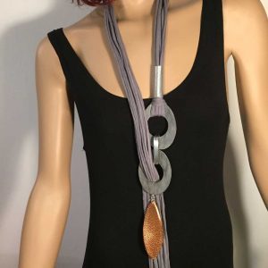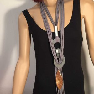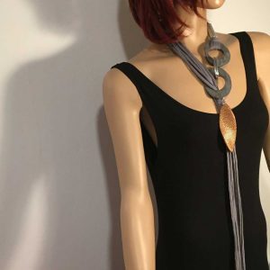 Die langen Bändern wurde auf ein Aluelement geknüpft sind besonders für lange Kleider geeignet, um den Hals ist ein Nappalederband oder Kautschukband mit Magnetverschluss