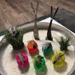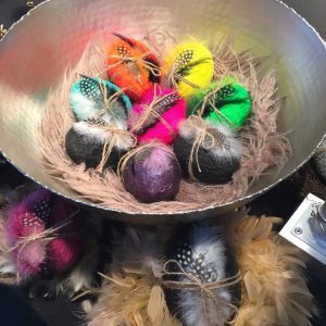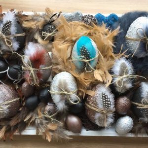Die Styropor-Eier wurden mit Strukturpaste grundiert, mit bunten Farben besprüht und mit Federn verziert. Schmückt den Ostertisch und ist auch eine nette Geschenkidee