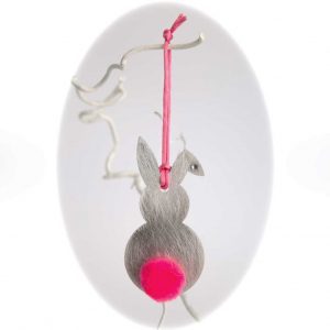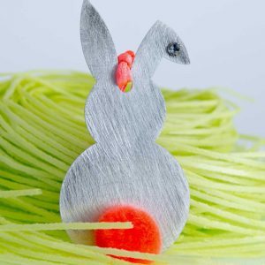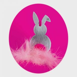 Zum Inhalt springenOsterhasen, Alu poliert mit Bommel und Swarovski-Stein im Öhrchen