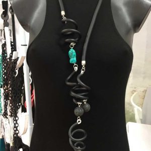 Diese Kette besteht aus Aludraht und Kautschuk gedrehten Spiralen mit Lavakugel und Türkis mit Kautschukband. Die Kugeln können von mir auf deinen Wunsch auch aus anderen Materialien eingebaut werden.